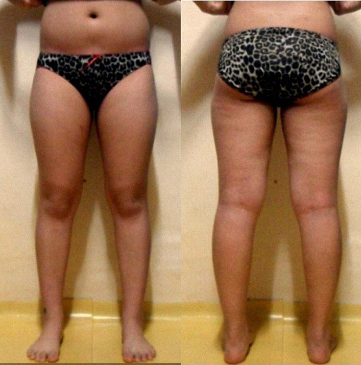 전체적인 아담한 체형에 비하여 허벅지 및 엉덩이의 지방세포가 과다하게 발달하였고