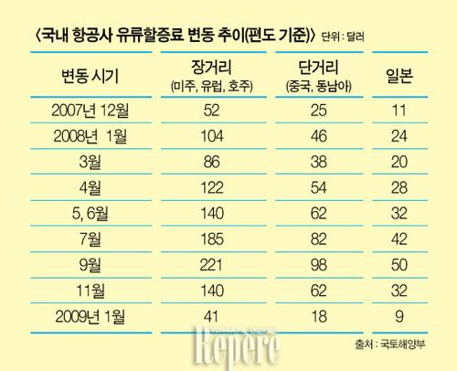 지난해 유류할증료는 국제 유가의 변동에 따라 큰 폭으로 변동했다. 장거리 노선(미주, 유럽, 호주)의 경우 2007년 12월 52달러에 불과하던 유류할증료가 지난해 9월에는 221달러로 4배가량 치솟았고, 이후에는 유가가 떨어지면서 유류할증료도 내려가고 있는 상황이다. 2007년 12월 원화 대비 미국 달러의 평균 환율은 930.5원, 2008년 9월은 1천130원이었으므로 약 4만8천400원에서 약 25만 원으로 20만 원가량이 올랐다. 이 금액은 고스란히 여행 경비 상승으로 이어졌다.